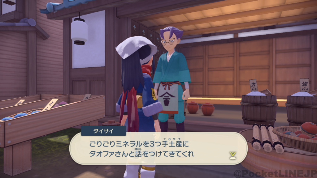 雑貨屋のタイサイに話しかける。 ※『メイン任務11 危ない山登り』と『サブ任務 43 また新商品を仕入れたい』を受けた後