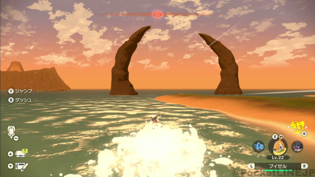 夕方に「群青の海岸」の「海岸ベース」へ向かい。「二本の岩」の間を通る。