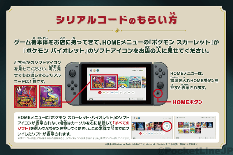 コードは1枚で両方が含まれており、Switchのホーム画面でソフトアイコンを表示させ、店員さんに見せるだけで受け取れます。対象はパッケージ版・ダウンロード版両方。1人1回限りなので注意してください。無くなり次第終了で、有効期限は10月23日まで。『LEGENDS Z-A』では受け取れないので、『スカーレット/バイオレット』を準備して店頭へGO!